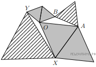 Версия для печати и копирования в MS WordШесть равносторонних треугольников расположены, как на рисунке. Докажите, что сумма площадей заштрихованных треугольников равна сумме площадей закрашенных треугольников.