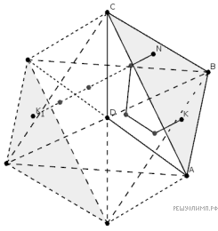 Будем последовательно «выпрямлять» путь луча следующим образом: если в какой-то момент луч должен отразиться от некоторой плоскости, будем считать, что он продолжает свой путь, но в «зеркальной» копии пирамиды. Заметим также, что в силу перпендикулярности рёбер DA, DB и «DC» плоскости (ABD), (BCD) и (CAD) при симметрии относительно друг друга остаются на месте. Поэтому, результатом нашего «выпрямления» будет отрезок NK1, где K1 точка, полученная из K после последовательных отражений относительно плоскостей (ABD), (BCD) и (CAD) в некотором порядке. Длина отрезка NK1 при этом как раз равняется суммарной длине, пройденной лучом.