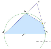 Версия для печати и копирования в MS WordОкружность с диаметром AB пересекает отрезки AC и BC в точках M и N, соответственно, причем длина отрезка MN равна радиусу окружности. Найдите площадь четырехугольника ABN, если известно, что AC = 12 и BC = 8.