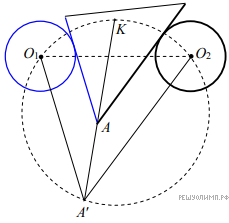 Точки биссектрисы угла A между серой и чёрной сторонами деревянного треугольника равноудалены от этих сторон (серый цвет изображаем синим). Проведём через центры O1 и O2 серого и чёрного кругов прямые, параллельные этим сторонам. Пусть они пересекаются в точке Поскольку угол