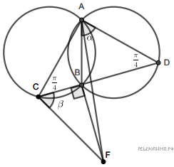 Версия для печати и копирования в MS WordДве окружности одинакового радиуса 9 пересекаются в точках A и B. На первой окружности выбрана точка C, а на второй – точка D. Оказалось, что точка B лежит на отрезке CD, а На перпендикуляре к CD, проходящем через точку B, выбрана точка F так, что