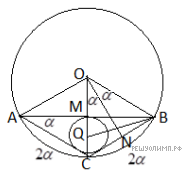 Из условия, точки O и Q лежат на срединном перпендикуляре отрезка AB, треугольник ABC равнобедренный, тупоугольный, с углом α при основании, получаем