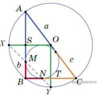 Пусть треугольник ABC — наш треугольник с прямым углом B, точка O — центр его описанной окружности, точки M и N — точки касания вписанной окружности с катетами AB и BC, точки X и Y — середины дуг AB и BC соответственно. Достаточно доказать, что точки M и N лежат на прямой XY. Опустим из точки O перпендикуляры OS и OT на катеты AB и BC и продлим перпендикуляры до пересечения с описанной окружностью в точках X и Y соответственно. Пусть a, b, c — длины касательных из точек A, B, C к вписанной окружности.