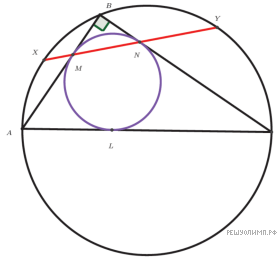 Пусть точка P — проекция точки A на биссектрису угла C, точка Q — проекция точки C на биссектрису угла A. По Задаче 255 точки P и Q лежат на прямой MN. Так как то точки P и Q совпадают соответственно с точками X и Y. Значит, отрезок PQ — искомая хорда. Так как лучи AQ и CP — биссектрисы, то точки P и Q — середины дуг AB и BC соответственно. Тогда центральный угол окружности, опирающийся на хорду PQ, прямой, и поэтому