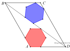 Параллелограмм ABCD разделён диагональю BD на два равных треугольника. В треугольник ABD вписан правильный шестиугольник так, что две его соседние стороны лежат на AB и AD, а одна из вершин — на BD. В треугольник CBD вписан правильный шестиугольник так, что две его соседние вершины лежат на CB и CD, а одна из сторон — на BD. Какой из шестиугольников больше?