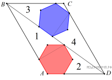 Параллелограмм разделён на два данных шестиугольника, четыре невыпуклых четырёхугольника, которые мы обозначили на рисунке цифрами 1, 2, 3, 4, и треугольник, примыкающий к вершине C. Заметим, что четырёхугольники 1 и 4 подобны — они получаются вырезанием из двух подобных прямоугольных треугольников равнобедренных треугольников с углом 120° при вершине. Аналогично, подобны четырёхугольники 2 и 3. Заметим, что коэффициенты подобия равны отношению сторон данных шестиугольников. Но площади половинок параллелограмма ABD и CBD равны, причём половинка ABD состоит из первого шестиугольника и четырёхугольников 1 и 2, а вторая — из второго шестиугольника, четырёхугольников 3 и 4 и ещё белого треугольника. Значит, сторона шестиугольника, примыкающего к вершине A, больше.
