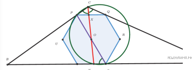Второй способ. Заметим, что точки P, C, S, K лежат на одной окружности. Требуется сравнить её хорды CK и PS — диагонали правильных шестиугольников. Чтобы сравнить хорды, достаточно сравнить величины меньших дуг, которые они стягивают. Не умаляя общности, тогда угол CKS не острый, и равный ему угол CPS — тоже не острый. Тогда тупыми будут углы PKS и CPK, откуда дуги PKS и CPK меньше полуокружности, их нам и надо сравнить. Общую часть этих дуг можно выбросить и сравнить дуги CP и KS, а для этого достаточно сравнить хорды CP и KS. Пусть X — точка пересечения PQ и C K. Тогда